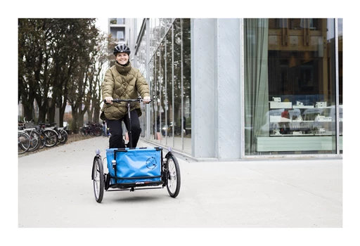 Cyklen leveres som standard med en robust presenning til ladet, som fås i farverne sort, gul, blå og rød.